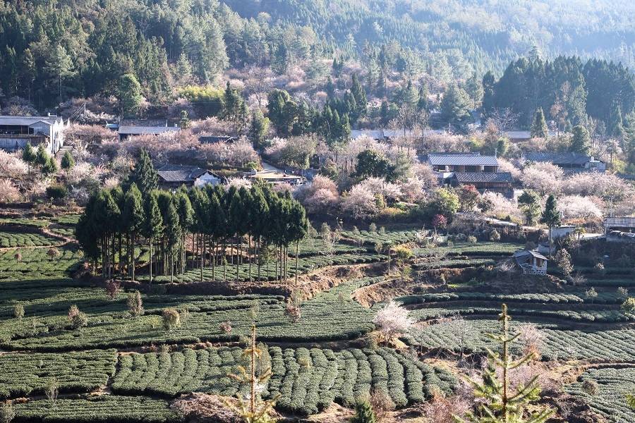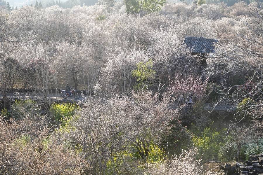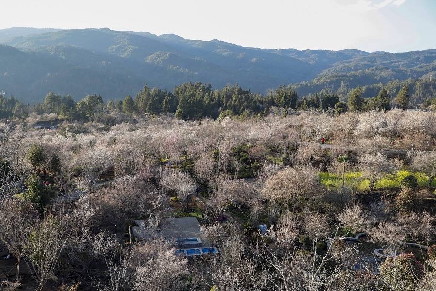 r春节前夕,云南省腾冲市中和镇中营村万亩梅花竞相绽放,吸引众多游客自驾前往赏花游玩。